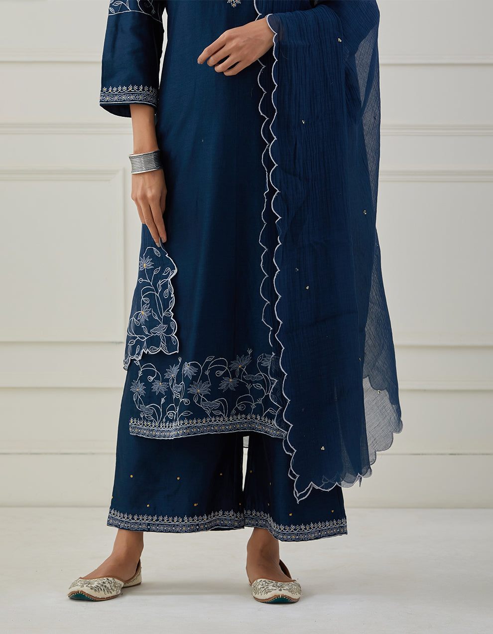 Beautifully crafted with chanderi silk fabric, the palazzo pants from the "Bandhan collection" showcases the beauty of threadwork when complemented with Chanderi silk fabric. Meticulously designed from the century-old weaving technique, the palazzo pants are celebratory yet comfortable to wear. Ready to remain a classic piece in your wardrobe for years to come, these bottoms can add the needed luxe appeal to any topwear. Ensure a noble look this festive season with these blue palazzo pants.