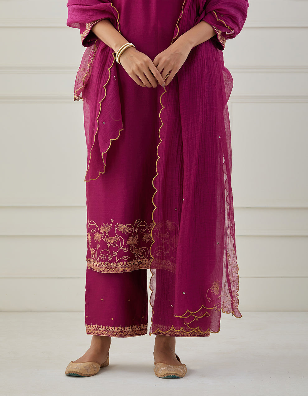 Beautifully crafted with chanderi silk fabric, the palazzo pants from the "Bandhan collection" showcases the beauty of threadwork when complemented with Chanderi silk fabric. Meticulously designed from the century-old weaving technique, the palazzo pants are celebratory yet comfortable to wear. Ready to remain a classic piece in your wardrobe for years to come, these bottoms can add the needed luxe appeal to any topwear. Ensure a noble look this festive season with these magenta palazzo pants.