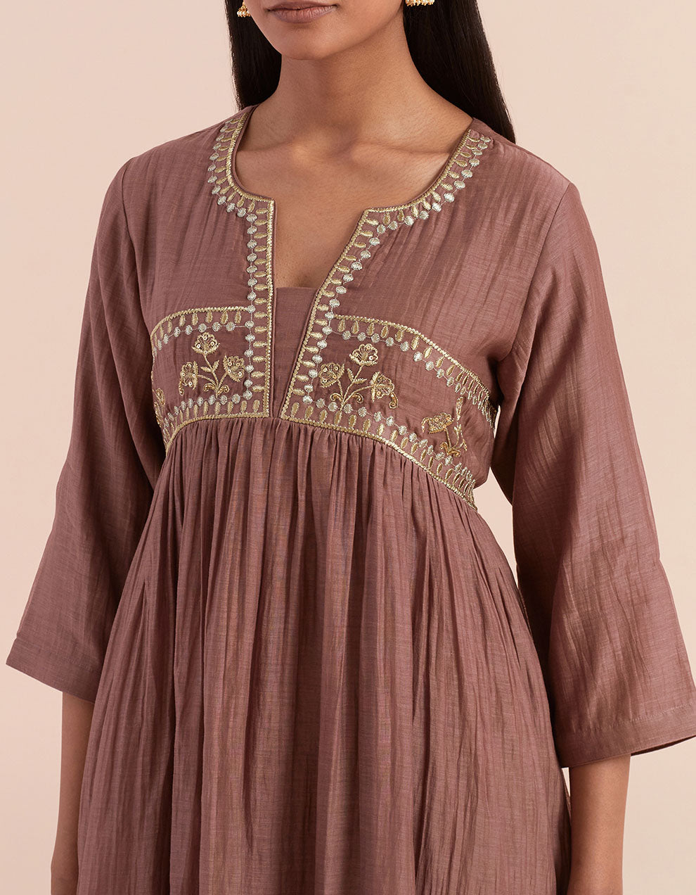 Crafted from the softest chanderi, our brown kurta is a silhouette of serene sophistication. Embellished with age-old zari artistry, every twist and turn of the golden and silver thread casts a spell of elegance on a blank chanderi canvas. Featuring a v-neck with a flowy silhouette, this kurta is a perfect blend of comfort and celebratory charm. Pair this kurta with matching pants and an embellished dupatta to complement your celebrations.