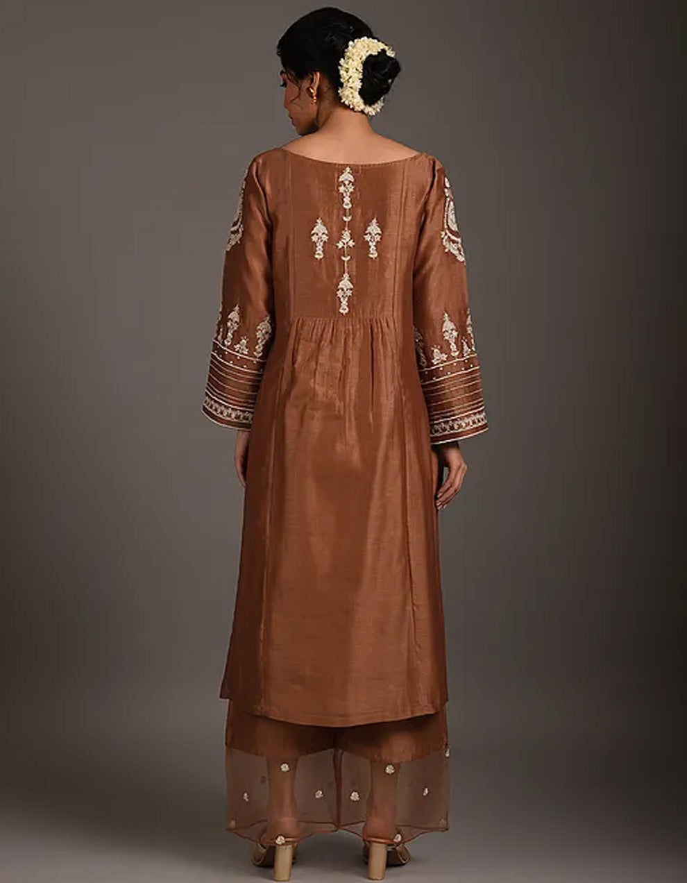 Brown embroidery chanderi silk kurta with silk pants - Set of 2