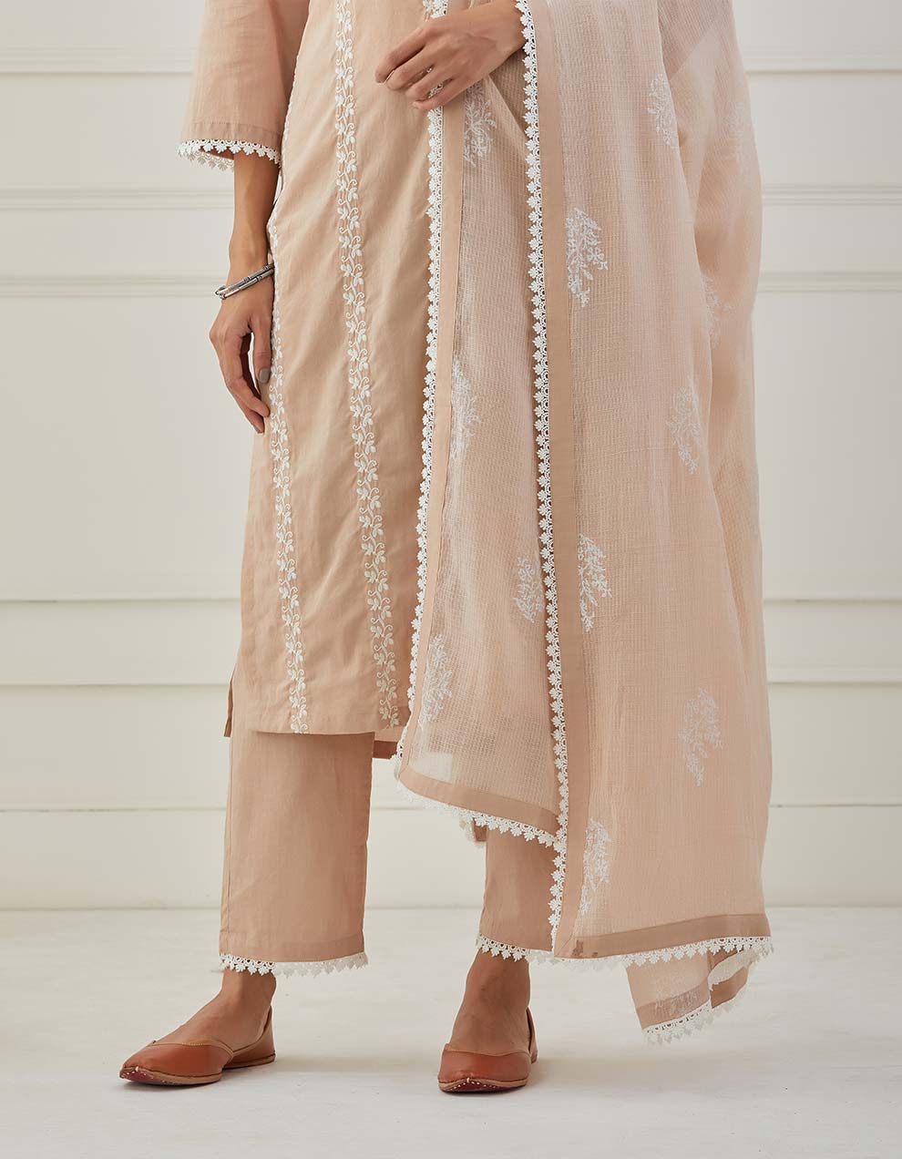 Pants that are both breezy and fun for the season,” the Sudha Collection showcases a piece that ideally fits your bottom wear goals. Elevated with the fine details of lacework embedded at the hem and the finest cotton fabric, these pants are made to never miss the mark of elegant and comfortable dressing. Trust these beige pants to elevate any look. Shop now!