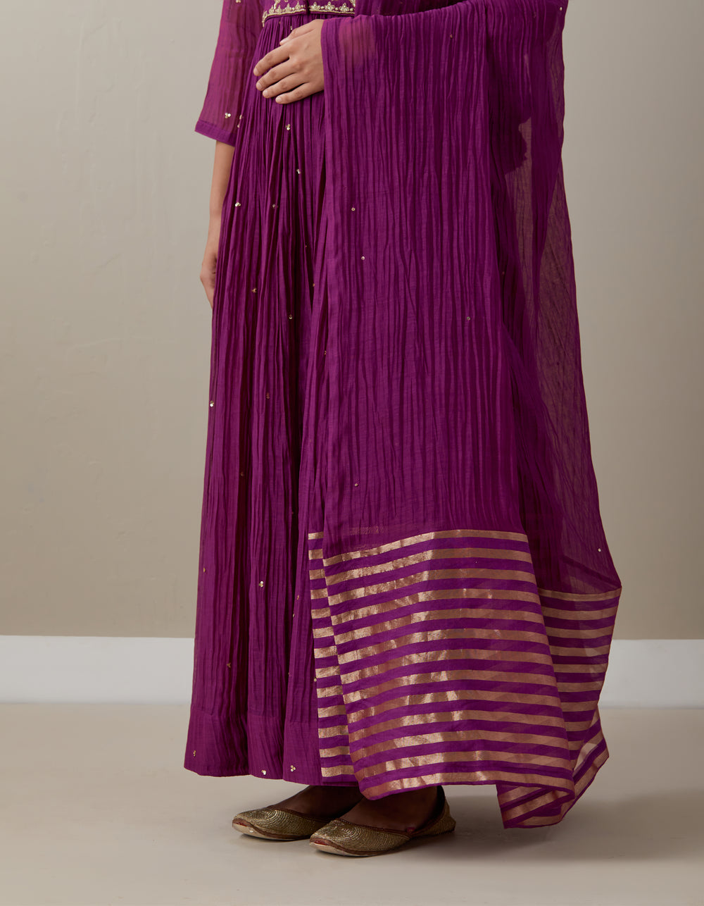 The subtle art of adorning ethnics with a graceful chanderi dupatta. An exquisite pick for those who revel in festivities and seek beauty in every detail. Weaving traditions, comfort, and celebrations in a flowy silhouette, our vibrant-hued dupatta flaunts fine craftsmanship for all your festive needs. Style this sequin and gold accentuated dupatta with your ethnic wear to offer you a showstopper look and a timeless style.