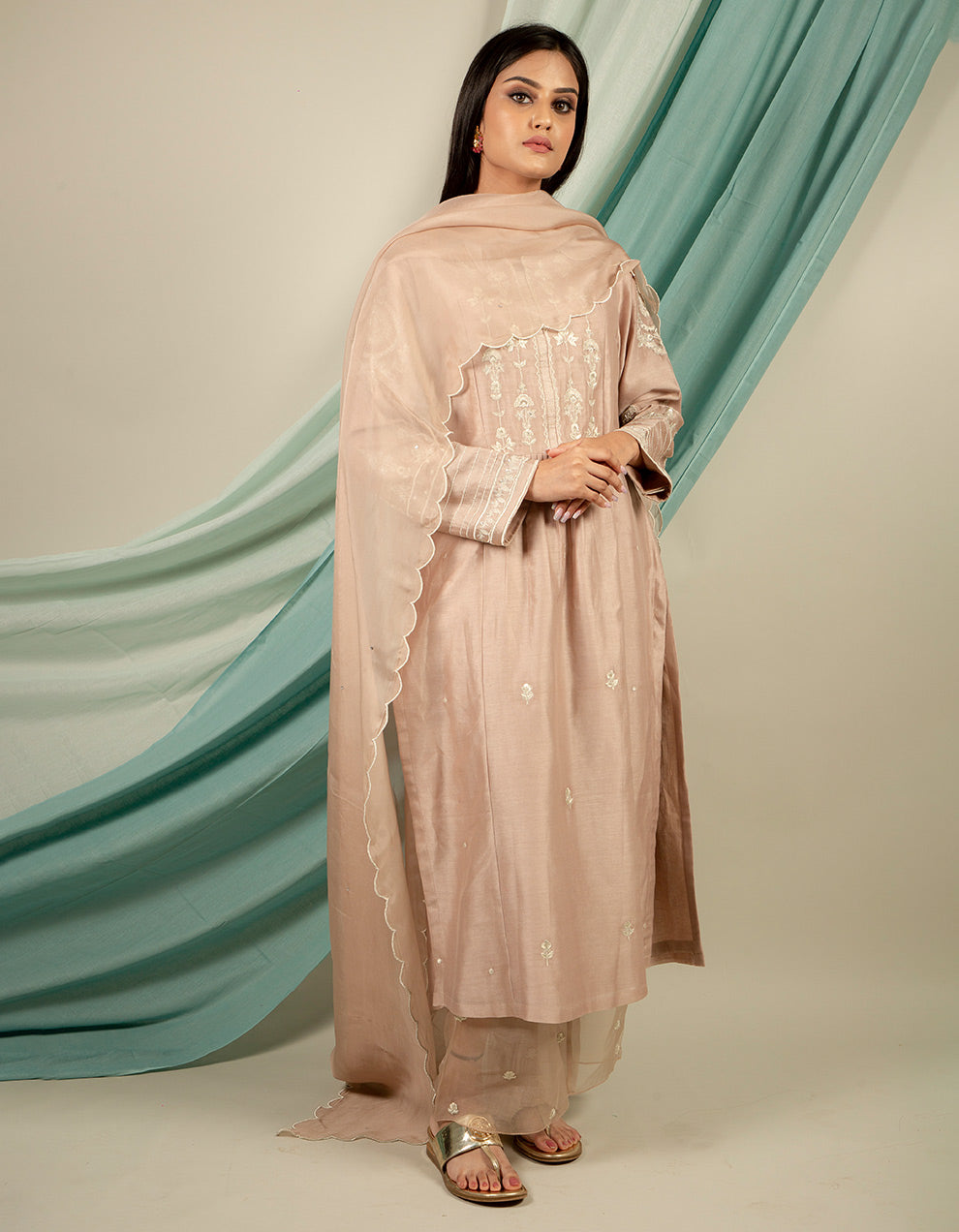 The silver brown hand embroidered scalloped organza dupatta is a must-have accessory if you are buying our silver brown hand embroidered Chanderi silk kurta. It perfectly complements the beautiful kurta and the palazzo to give the complete look of a traditional Indian woman.