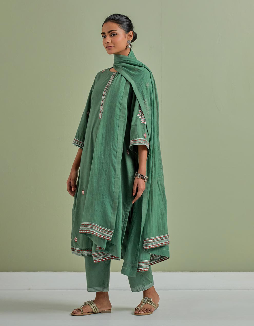 Green embroidered cotton kurta with pants and cotton dupatta- Set of 3