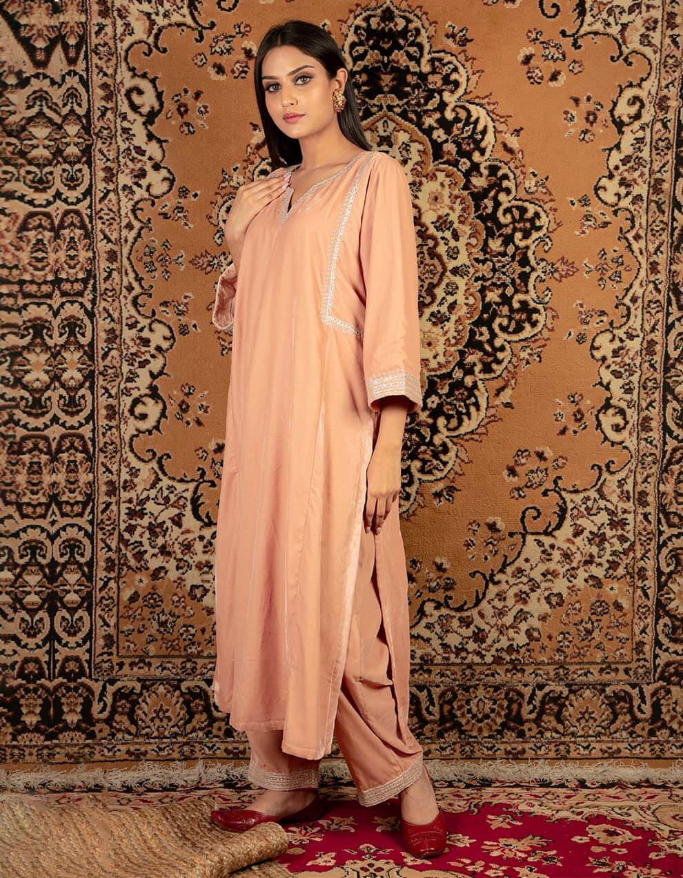 Peach silk velvet kurta with pants and tissue organza dupatta- Set of 3