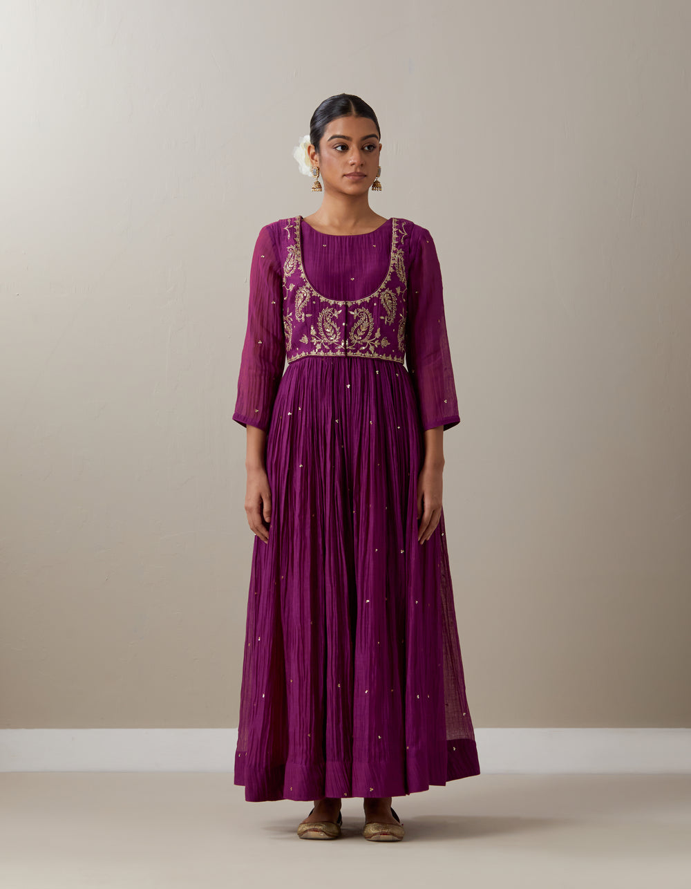 Wrap yourself in timeless anarkali, where the opulence of chanderi meets the ethereal elegance of golden embroidery. Each golden stitch and sequin adds a touch of tradition to your celebrations with its luminous glow. Every fold whispers a tale of heritage, artistry, and expert craftsmanship. Dipped in rich hues and adorned with classic paisley motifs, our kurta set delicately blends artistry and grace to elevate all your festivities.
