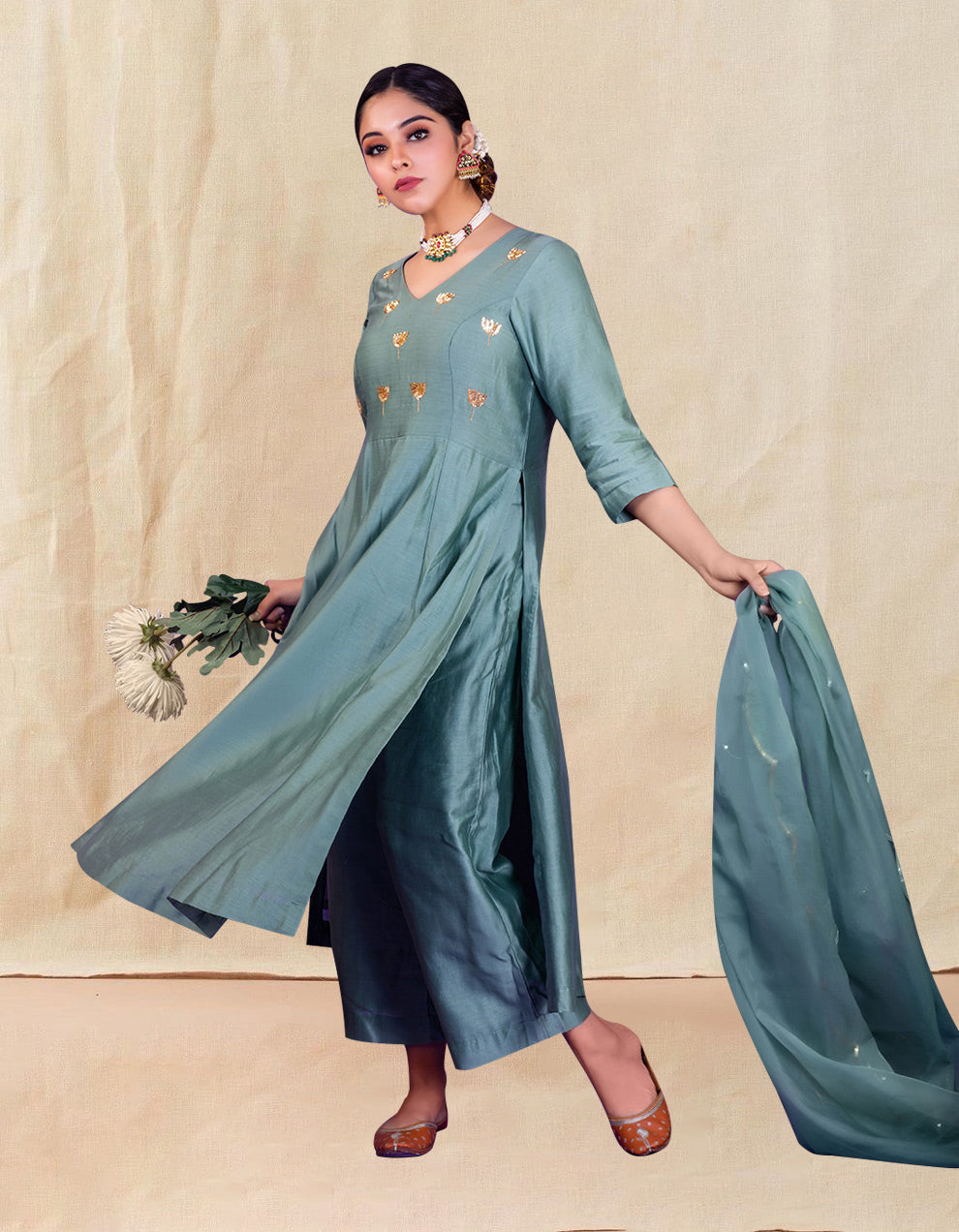 Sea Green hand embroidered chanderi silk kurta with silk palazzo and organza dupatta- Set of 3