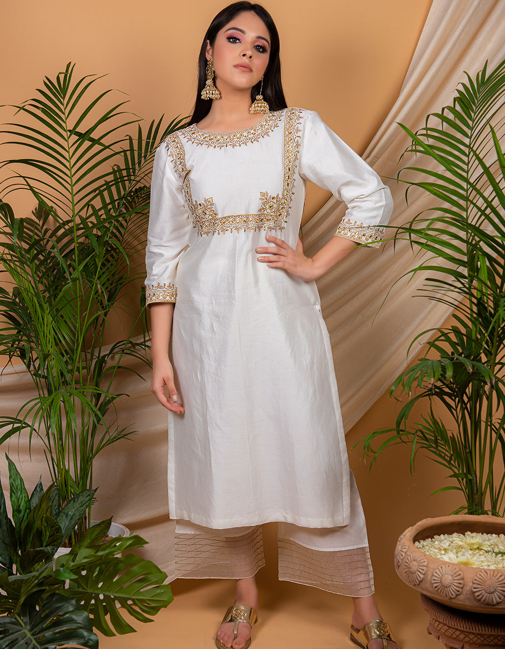 White hand chanderi silk kurta with silk palazzo and organza dupatta- Set of 3