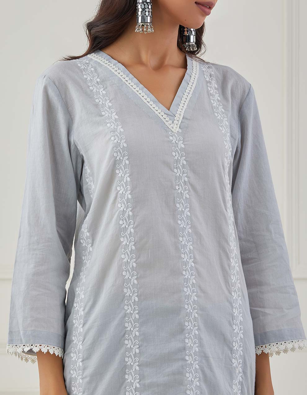 Feel nothing less than nature’s beauty in a striking ensemble that encapsulates the essence and traditions of the festive season while adding its contemporary touch to it. Everything, the cotton fabric, intricate threadwork, the grey color, and delicate lacework, comes together in a symphony that sings the songs of comfortable and elegant celebrations. Being the most sought-after piece that brings style and comfort to the table, this grey kurta showcases everything you need to enjoy the spotlight throughout the festive season. Shop this head-turning piece right away!