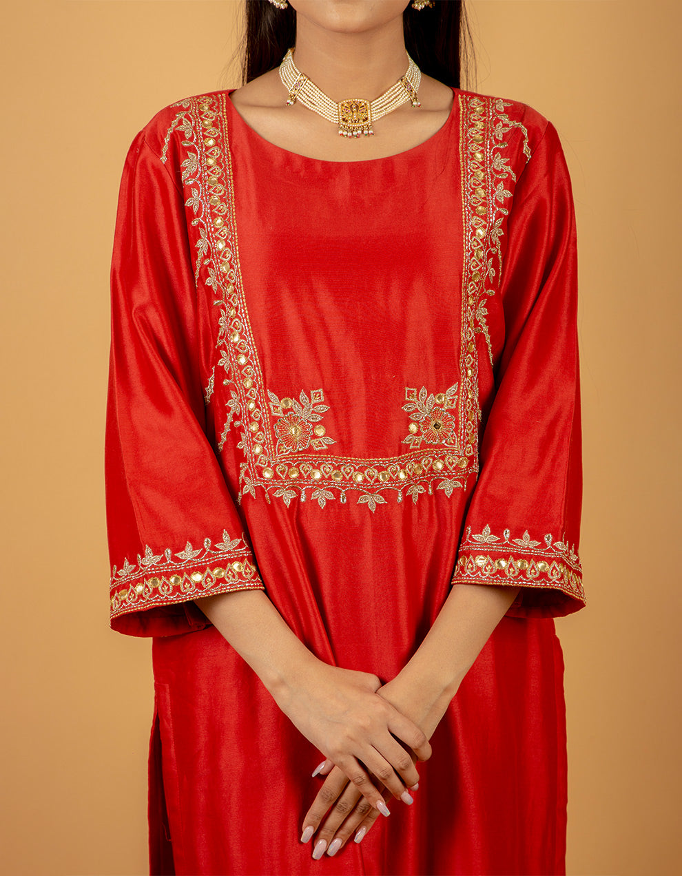 This beautiful hand embroidered red velvet Chanderi silk kurta is paired with matching palazzo pants. The set falls on a relatively minimal side, but you will look effortless and royal with the beautiful embroidery. The kurta features gorgeous gold embroidery on the entire neck with similar embroidery on the pants. You can buy this set in a variety of sizes ranging from XS to XXXL.