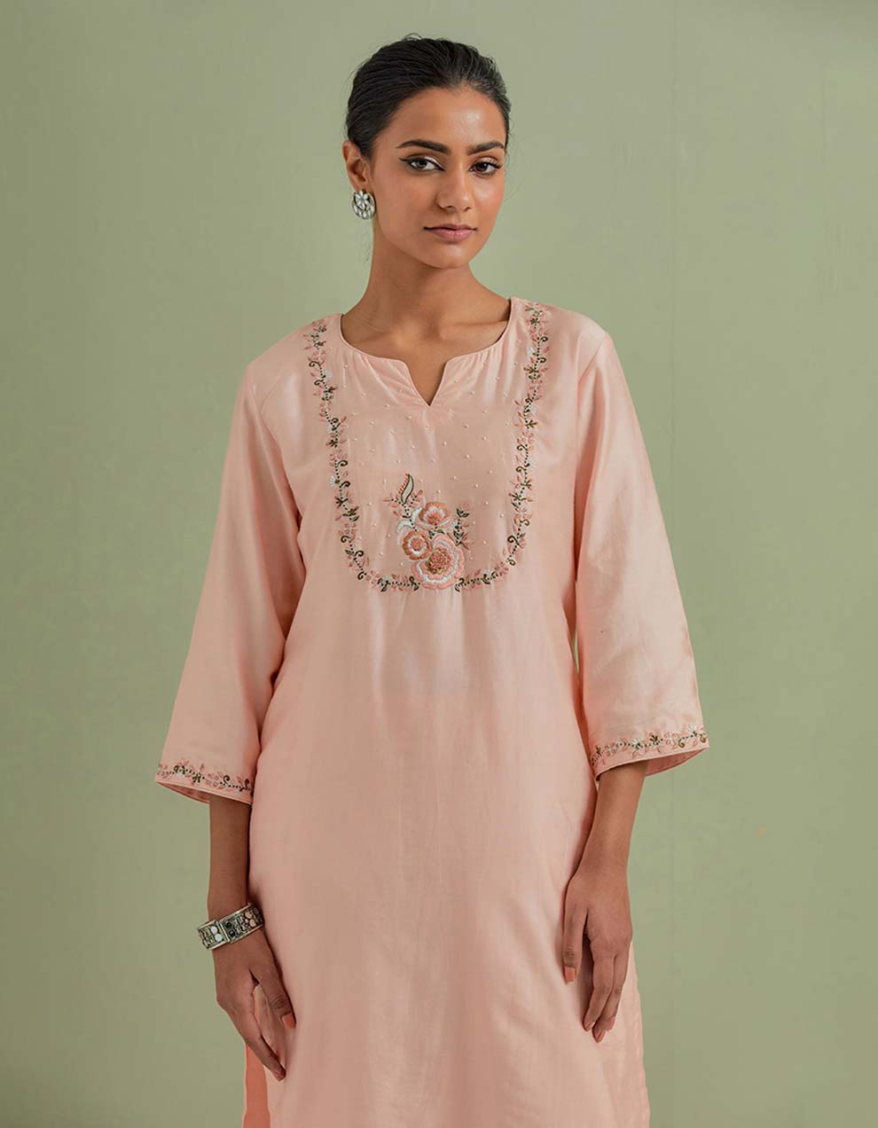 Simply designed to uplift your everyday look, this peach kurta is a fine piece of garment that defines the - “less is more” aesthetic. The Mohini Collection brings you the all rounder chanderi silk kurta that you can pair with your favorite bottom to create the ideal look for yourself. Created with embroidery on the chest and hem of the sleeve, this kurta has a split crew neckline. Make this kurta your style partner and upgrade your ethnic wear wardrobe now!