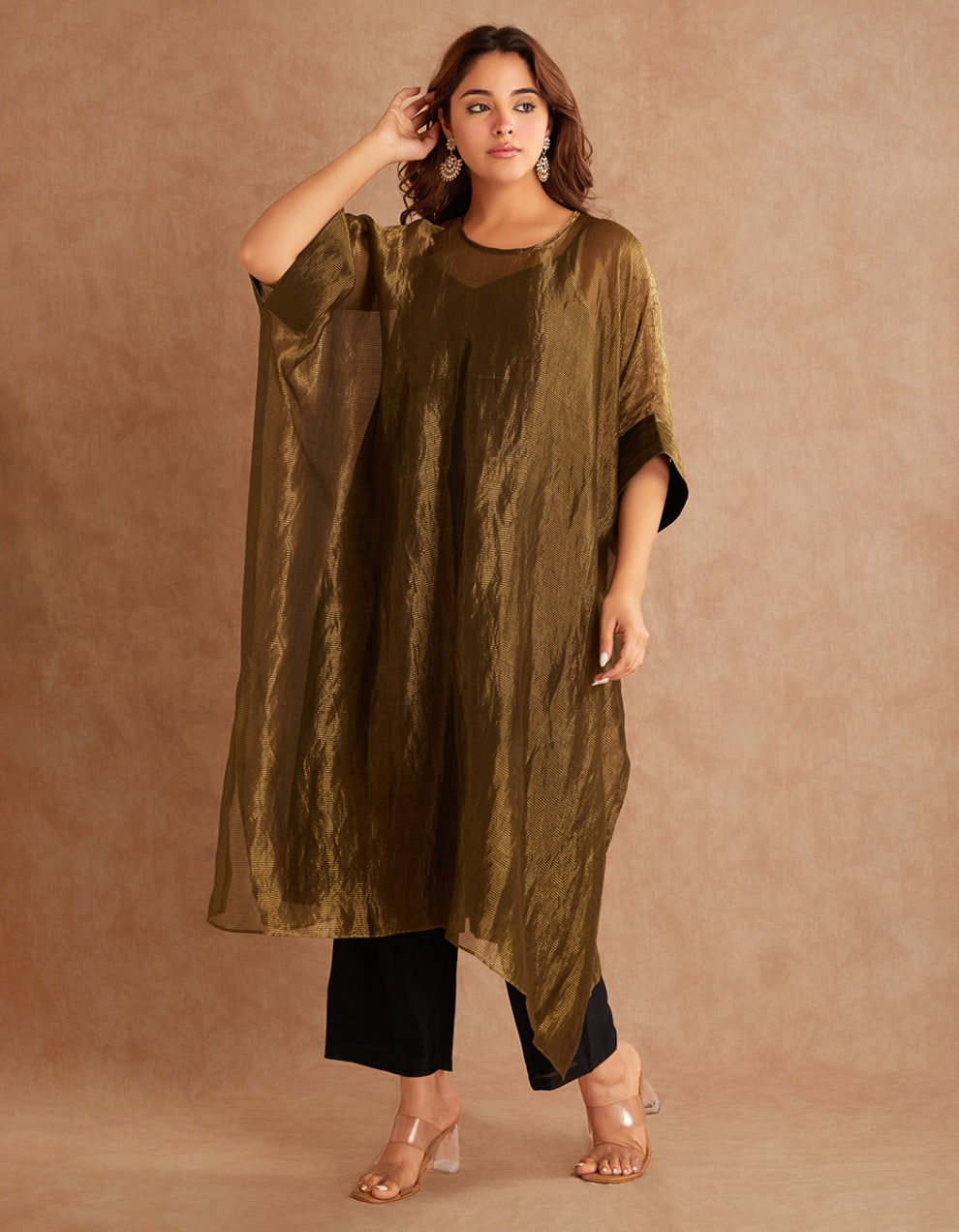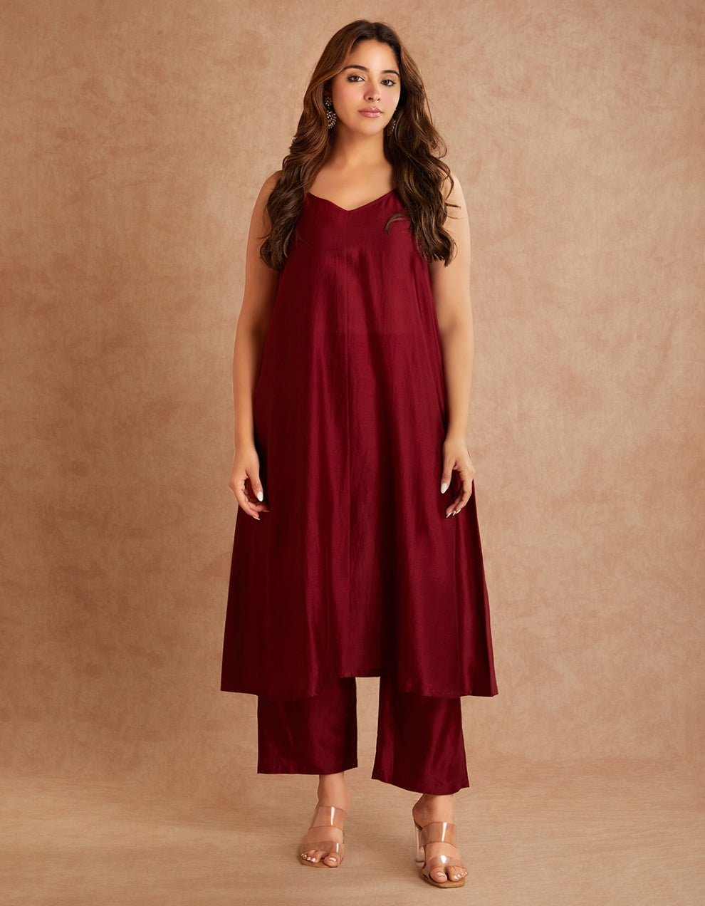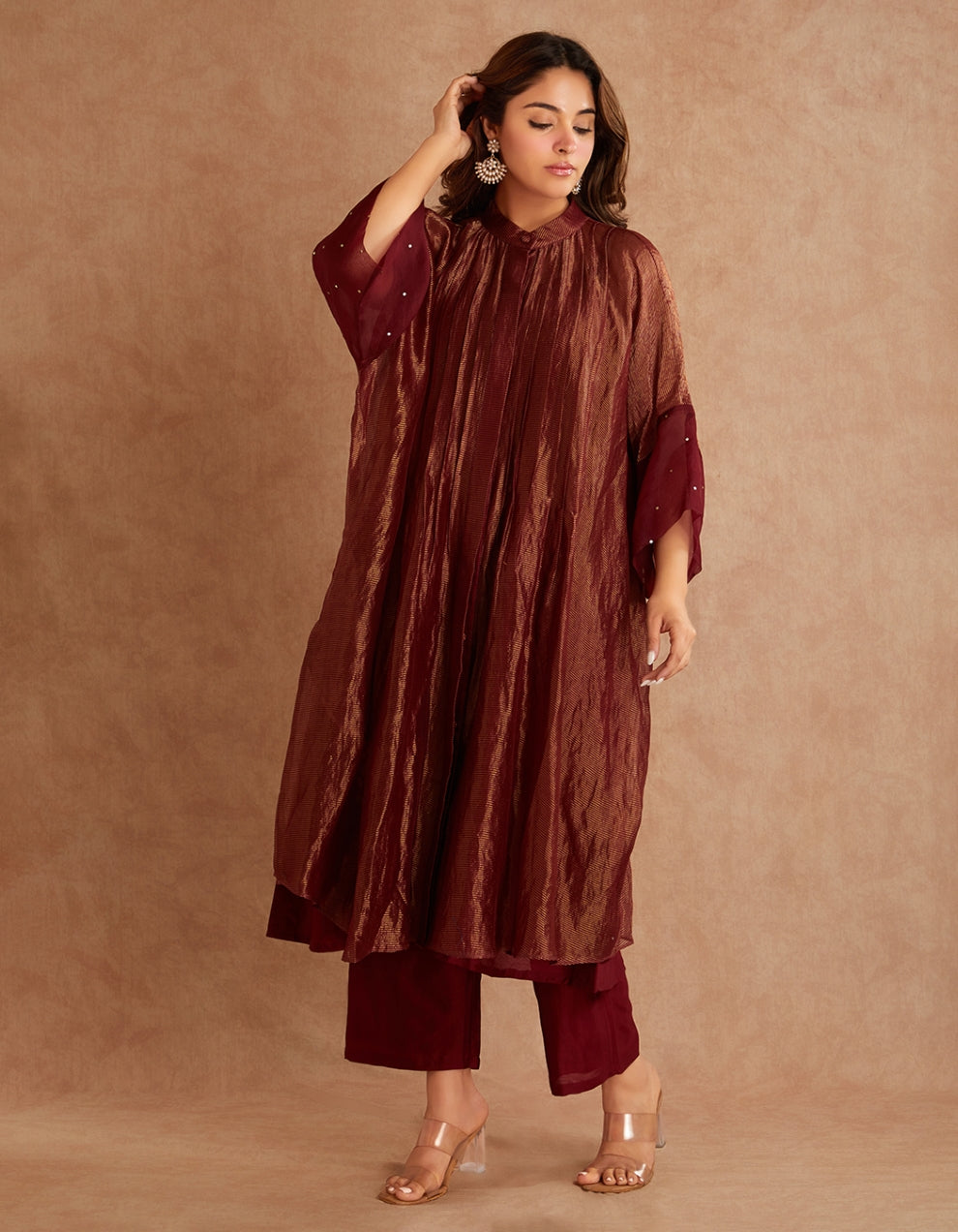 Maroon embroidered chanderi silk kurta with pants and shimmer organza dupatta- Set of 3