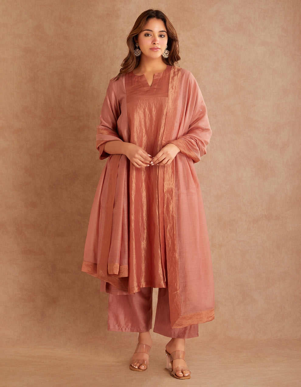 Escape the ordinary in our dust pink kurta set created from pure tissue, lending a graceful charm. The set is completed with a chanderi pants and dupatta, ensuring you look perfect for celebrations.