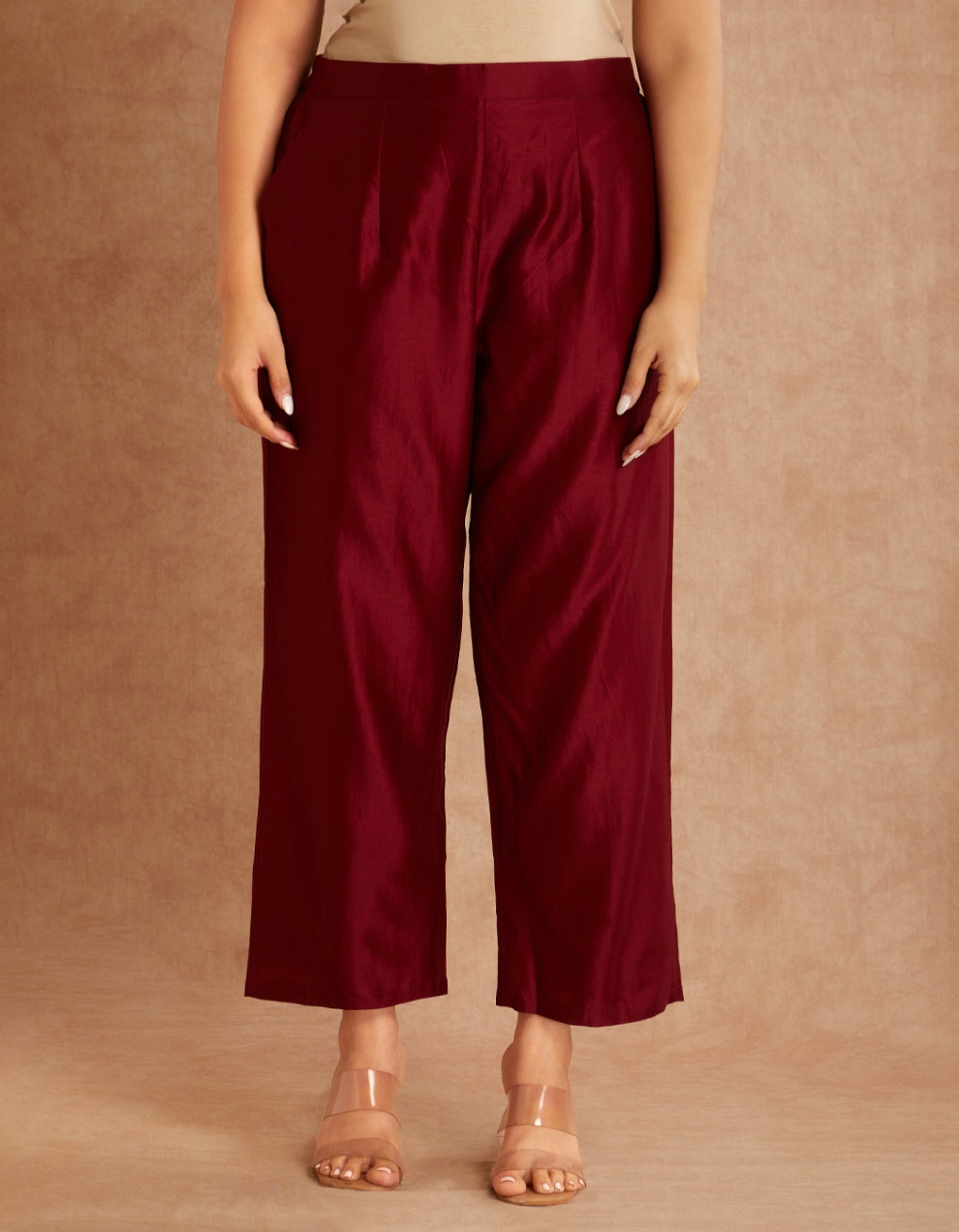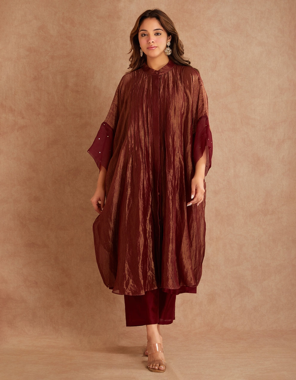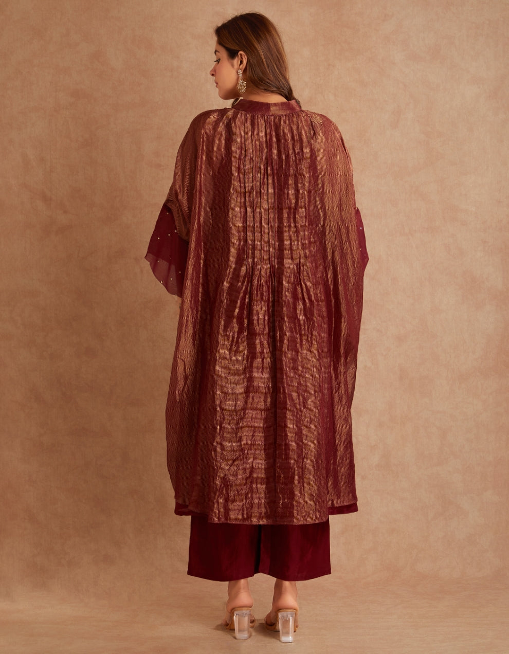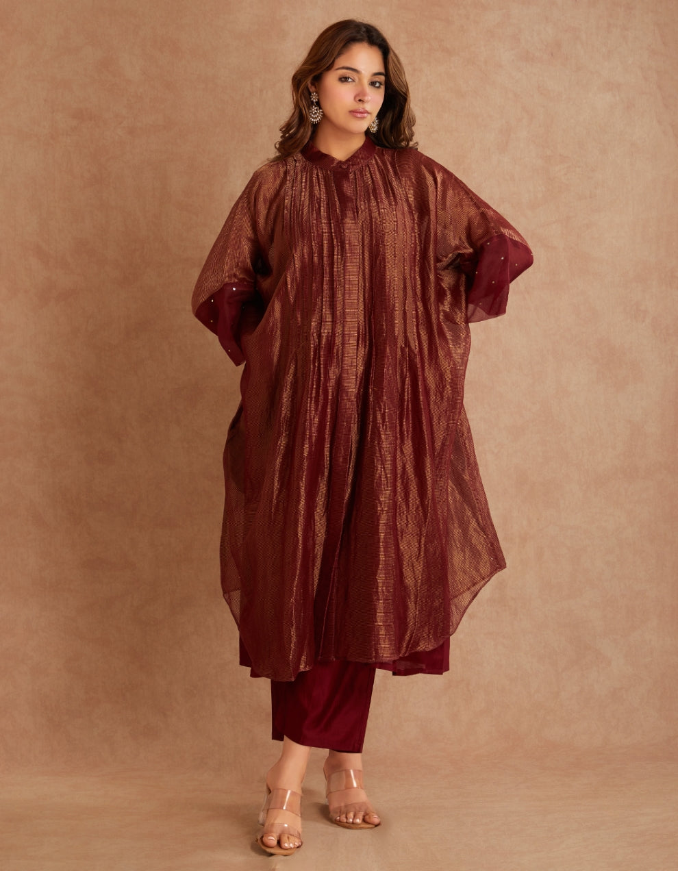 Our red co ord set fuses fluid silhouettes with understated drama. The look layers a sheer, textured overlay over a sleek inner set, creating depth, movement, and quiet luxury. The overlay jacket features sequin embellishments at the sleeves, whispering elegance rather than shouting it. Beneath it all, structured yet relaxed silhouettes and Chanderi bottoms anchor the look with modern minimalism.