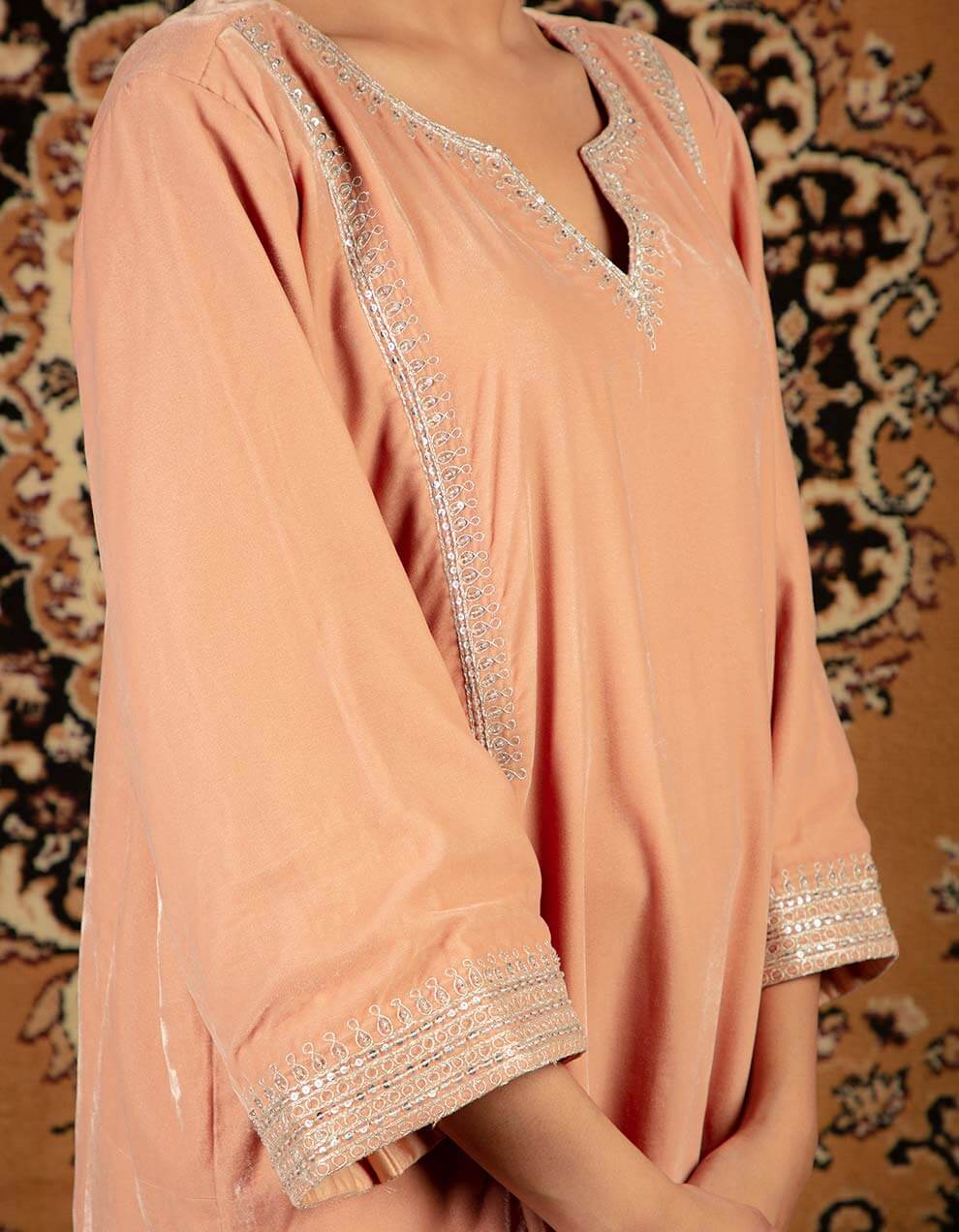 Dazzle everyone around as you walk into a wedding wearing this Peach silk velvet kurta with its astonishing charm. This pan neck kurta is embellished in silk velvet, zari, and hand embroidery work. The feature of the kurta that can make anyone fall in love with it is the minimalist embroidery and fabric quality.