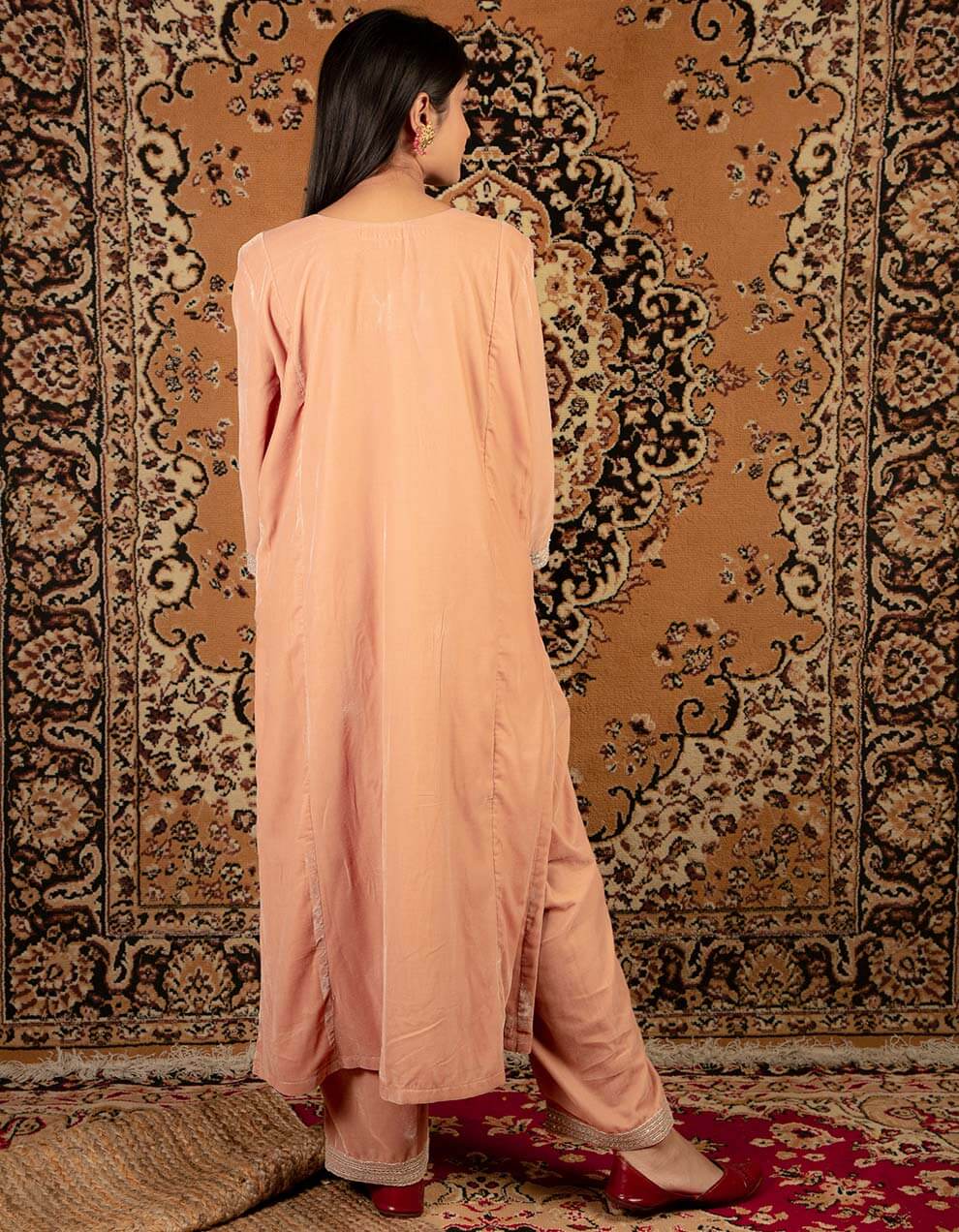 Look Fabulous and Beautiful wearing this peach silk velvet kurta set of 2 which surely deserves a Special Place in Your Wardrobe. This pan shape Neck and Full Sleeves silk velvet kurta, Prettified with zari and hand embroidered. Work is a dream come true for every fashion lover. Available with Peach silk velvet palazzo pants, this silk velvet kurta set of 2 can be your winter hit.